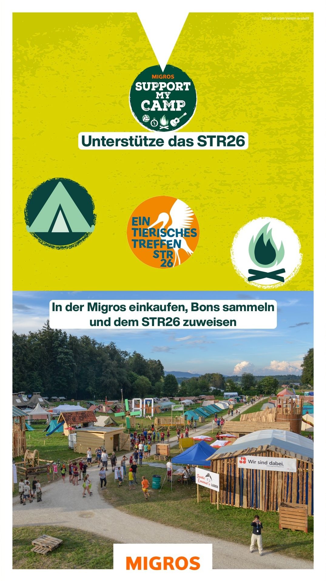 «Support my Camp» ist eine Förderaktion der Migros, bei der Lager für Kinder und Jugendliche finanziell unterstützt werden. Vom 5. Februar bis 15. April 2026 erhält man pro CHF 20.– Einkaufswert in der Migros einen Vereinsbon, der einem der teilnehmenden Vereine zugewiesen werden kann. Je mehr Bons ein Verein sammelt, desto höher fällt am Ende der Unterstützungsbeitrag aus.